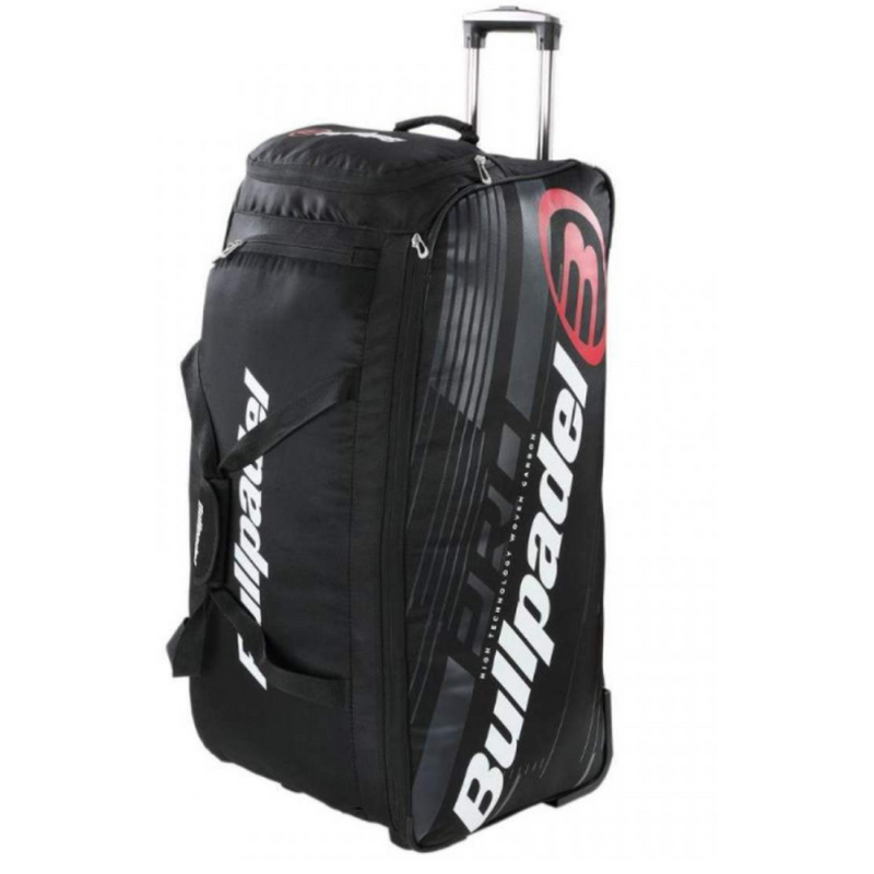 The Bullpadel BP24011 Trolley is a large-capacity wheeled padel bag designed to carry full kit for long trips or tournaments. It features a spacious main compartment for rackets, clothing and accessories, plus an external side compartment and a smaller top pocket for organising smaller items. The trolley includes durable wheels and a height-adjustable telescopic handle for easy transport over hard surfaces. The bag is finished in black with durable materials suited to regular use.