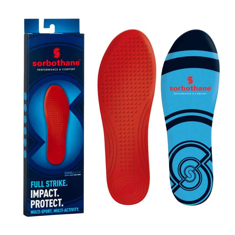 Designed to mimic the characteristics of human flesh, Sorbothane's unique visco-elastic material changes shape at each moment of impact to disperse shock waves sideways to protect the soles of your feet. If you experience pain on your feet throughout the day, whether through racket sports, running, the gym or through your work, Sorbothane Full Strike are the ideal choice to keep your entire foot protected.