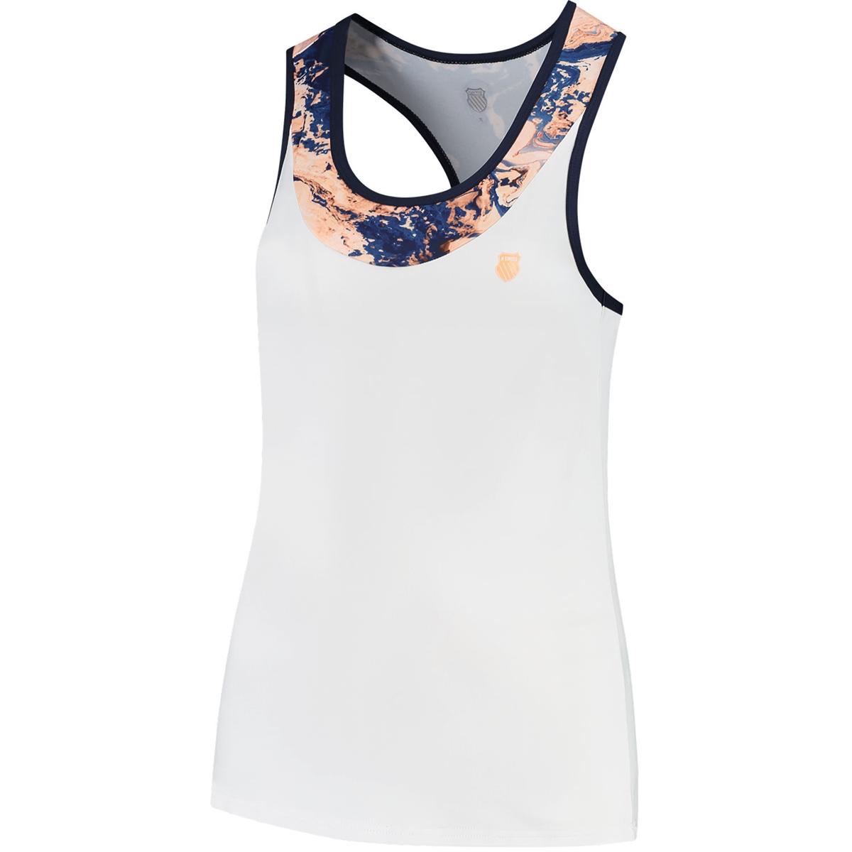 The Women's K-Swiss Hypercourt Singlet 3 features the brand logo elegantly positioned on the left side of the chest for a polished aesthetic. The thoughtfully chosen colours within the Hypercourt line are seamlessly integrated throughout the entire apparel collection, offering a stylish and enduringly classic appearance.